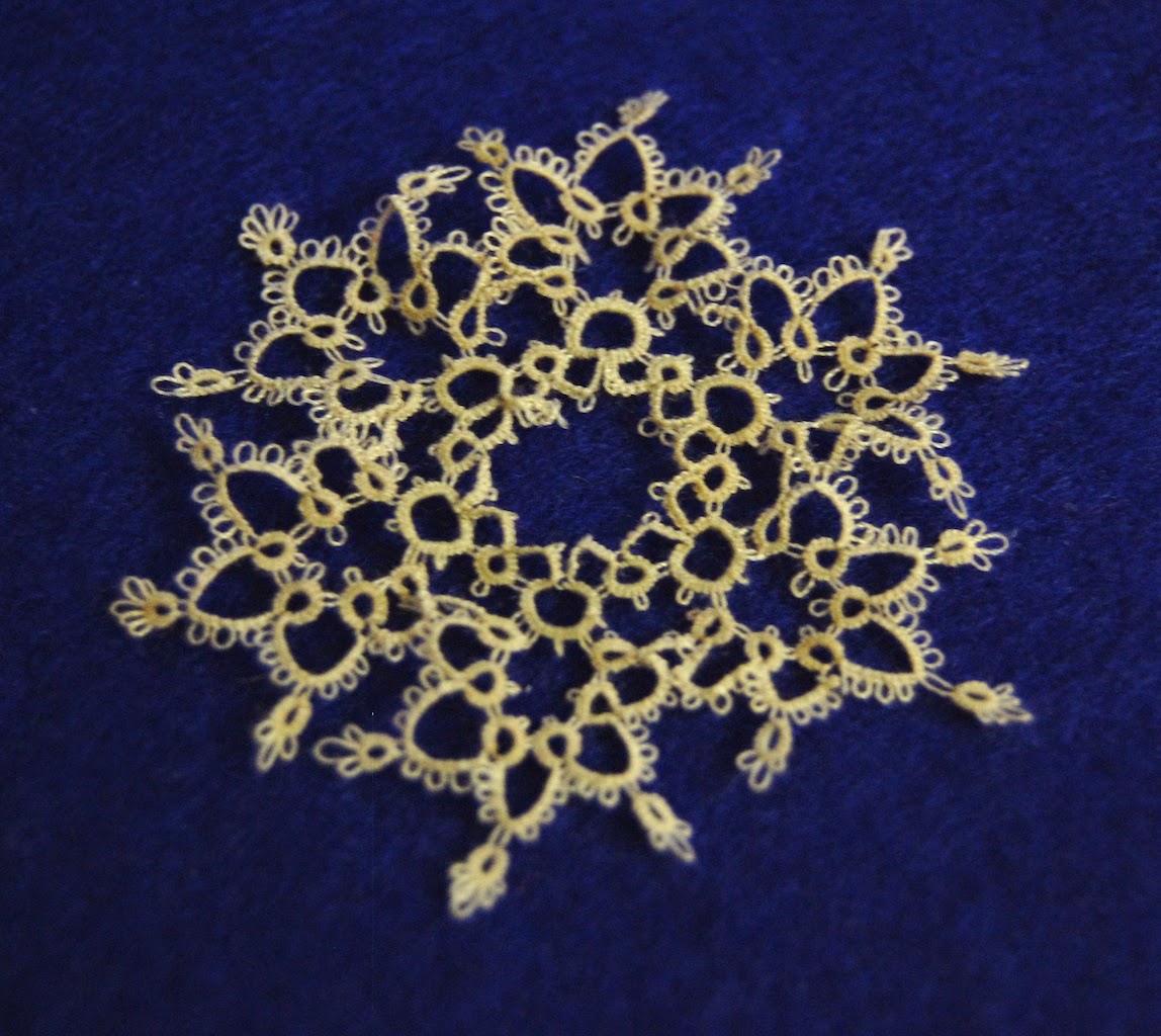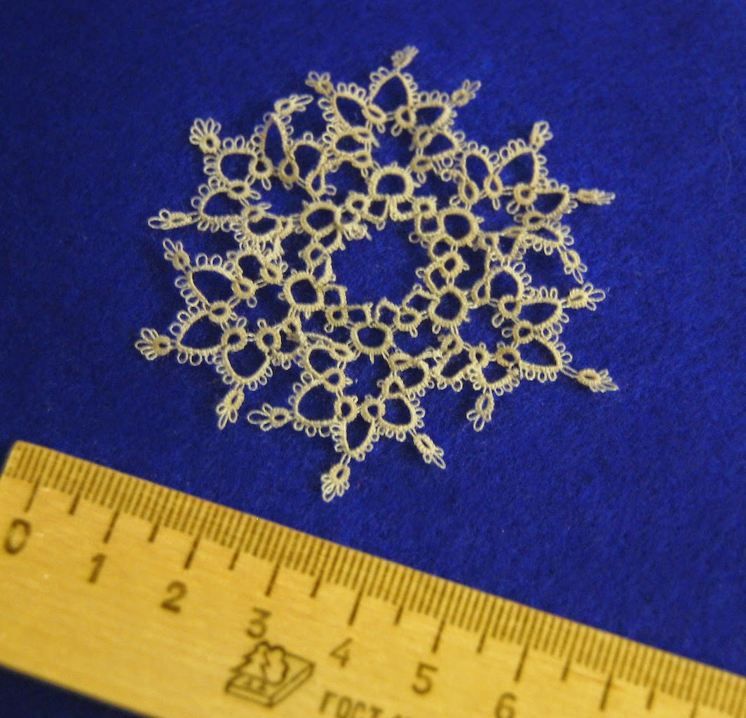 Я благодарна этой снежинке за то, что она сделала мои движения более скоординированными, но, думаю, на некоторое время мне следует отдохнуть от катушечных ниток в фриволите. Во-первых, они ужасно закручиваются, затягивание каждого кольца превратилось для меня под конец в пытку. Возможно, дело тут в марке ниток, но после того как в новой снежинке (уже третьей) у меня при затяжке кольца оборвалась нитка, я решила, что хватит, поплету-ка я лучше толстыми нитками. Во-вторых, я понять не могу, откуда берутся эти протяжки в местах смены элементов, там где из дуги, например, начинается кольцо, видно длинные ножки голой нитки. Иногда их удавалось избежать, но как это мне удавалось, понять не удается. Никакое затягивание не помогало.