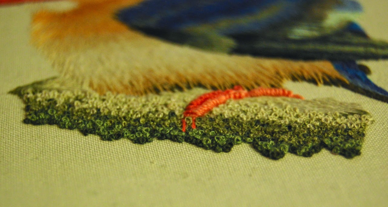 Вот так они выглядят вблизи — ветка вышита французскими узелками, а лапки — узелками рококо.
