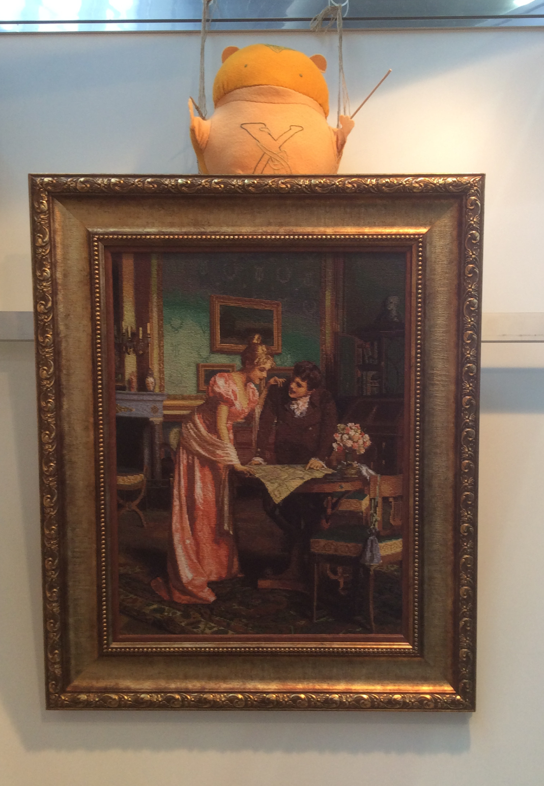 Хому на страницах блога уже появлялся, но на этот раз решила показать его очередное появление в свете. По традиции его повесили в правый верхний угол стенда, чтобы он как бы наблюдал за выставкой. А потом привезли мама привезла свою вышивку «Путешественники» и, за неимением другого места, повесила под ним. Получилось, на мой взгляд, замечательно. Он выглядит как украшение рамы. К тому же, под этим углом создается впечатление, что он дирижирует. Такой важный!