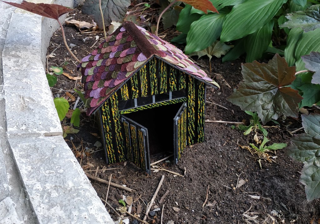 Впервые оформление вышивки приняло у меня подобные масштабы. Стены, двери и основа для крыши из пенокартона, «стекло», вырезанное из старой коробки от торта, черепица и пол из кусочков мебельной ткани. Покрасила стену изнутри и снаружи чёрным акрилом. А на заднюю стенку поместила уже готовую вышивку.