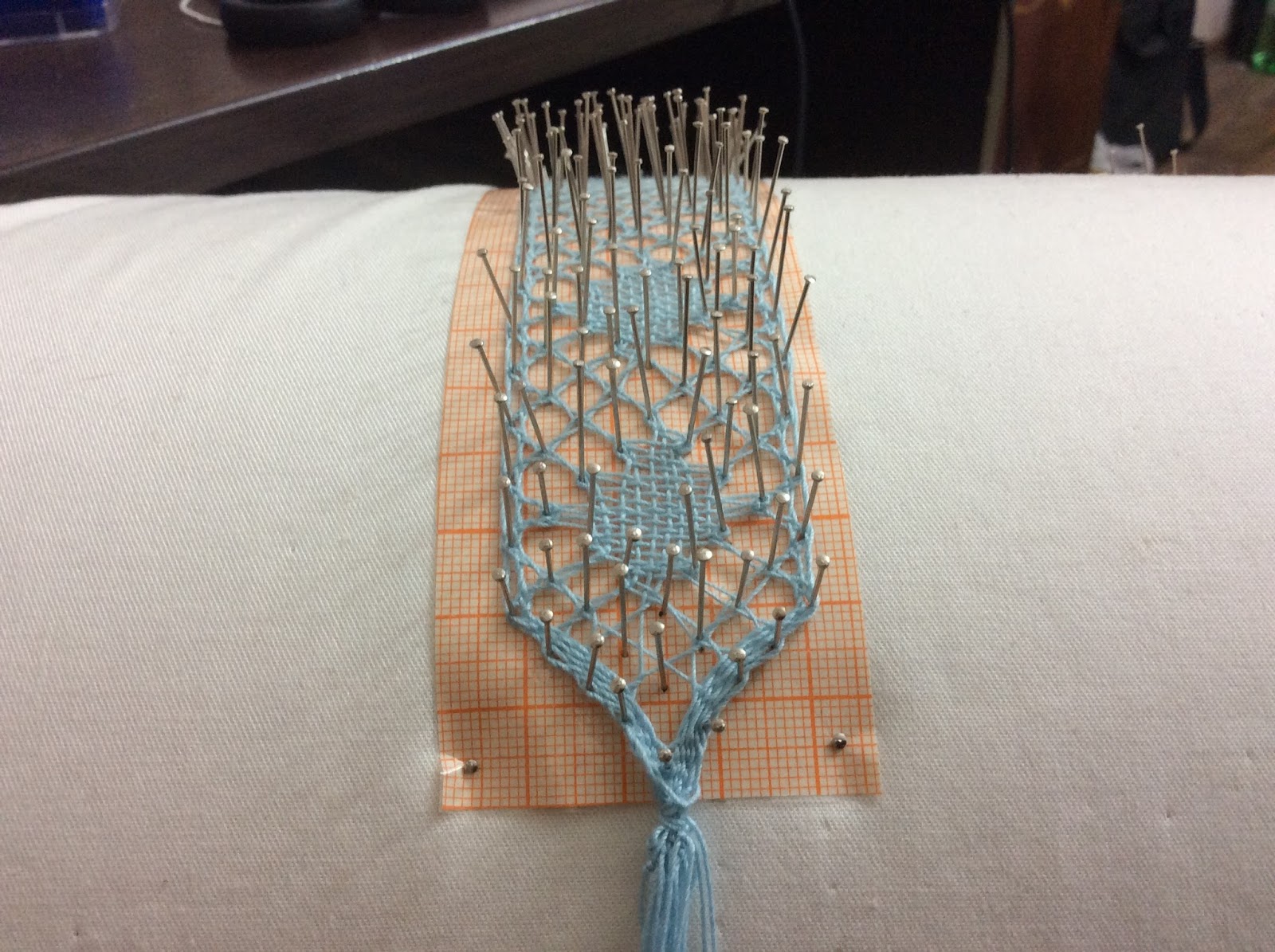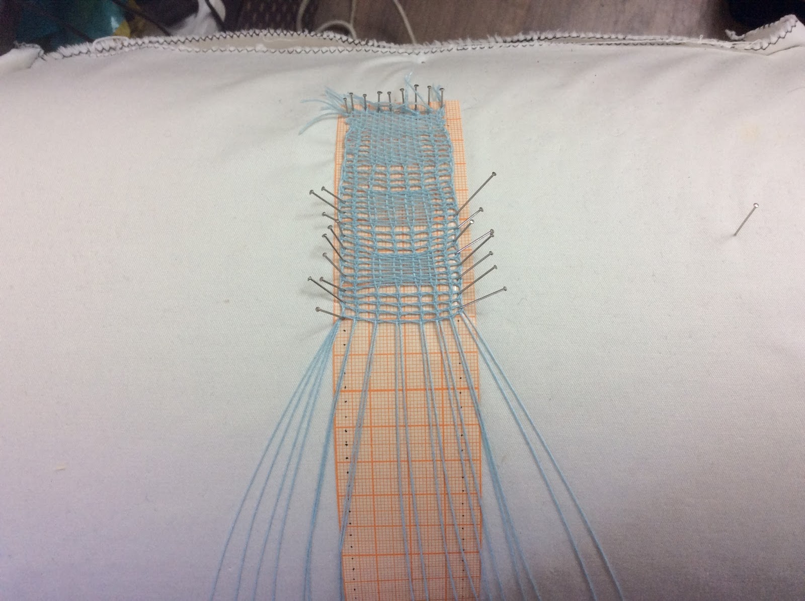 И момент, который у меня вызвал самые большие трудности — другие пропорции при плетении. В кружеве, которое я пыталась делать до сих пор, соблюдаются равные между вертикальными и горизонтальными нитями. Все «клеточки», образующиеся при плетения будут иметь разные стороны. Здесь же нерабочие нити навешиваются с большим расстоянием, а горизонтальные ряды делаются очень плотными. Я пока что тренируюсь на джинсовых нитках и мне кажется, что получается слишком рыхло. Нужно ещё поэкспериментировать с масштабом сколка.