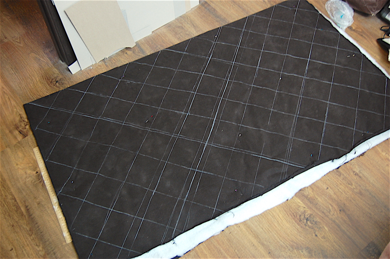 У меня давно лежал кусок плотной коричневой ткани. Я сложила его пополам (сгиб будет верхом), положила между слоями ткани синтепон и расчертила мелком будущие линии прострочки. Правда, уже на этом этапе получилось не очень ровно.